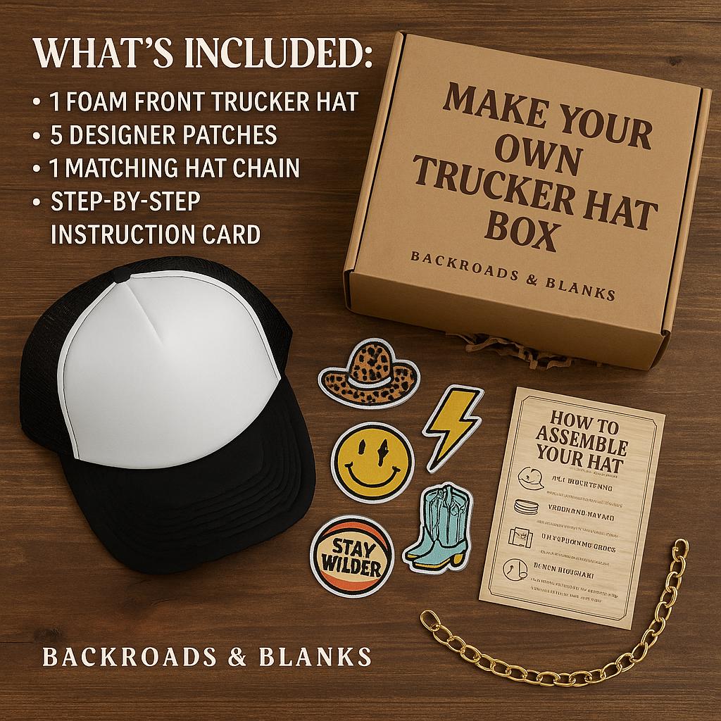 Bring the Backroads & Blanks Hat Bar experience home! Our Make Your Own Trucker Hat Box gives you everything you need to design, decorate, and rock your very own boutique-style hat — no event booth required.