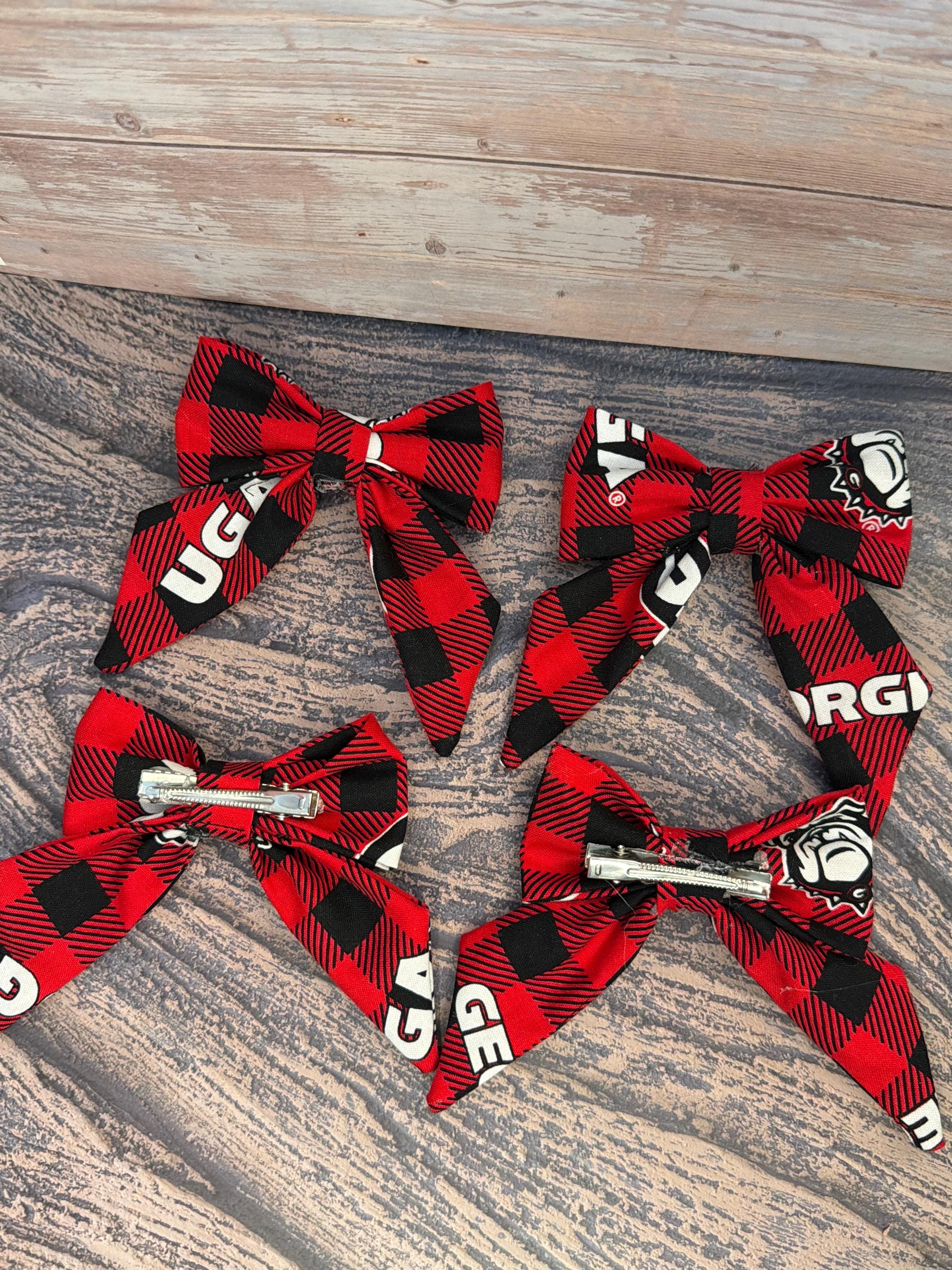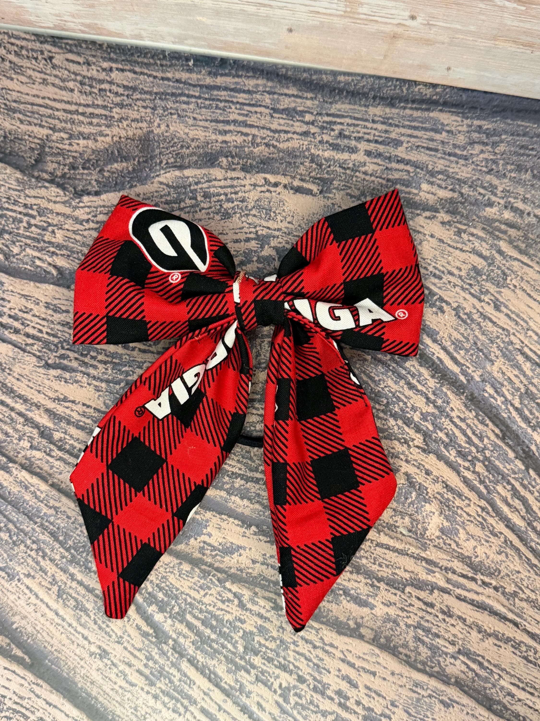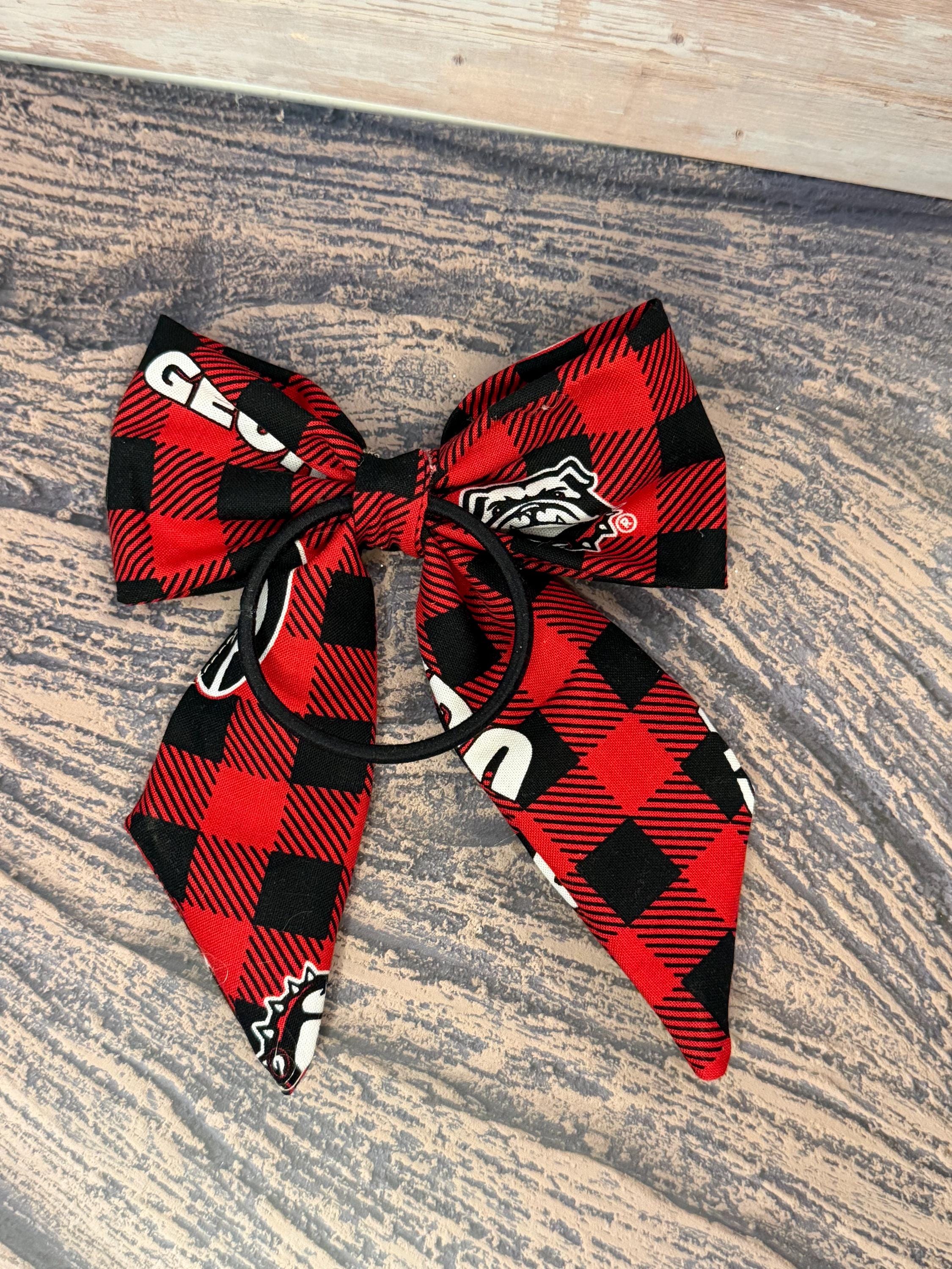 ✨ Details: • Handmade sewn fabric bow • Red & black plaid pattern (Georgia-inspired colors) • Attached to a soft, stretchy hair tie OR clip • Lightweight, durable, and comfortable • Perfect for girls of all ages