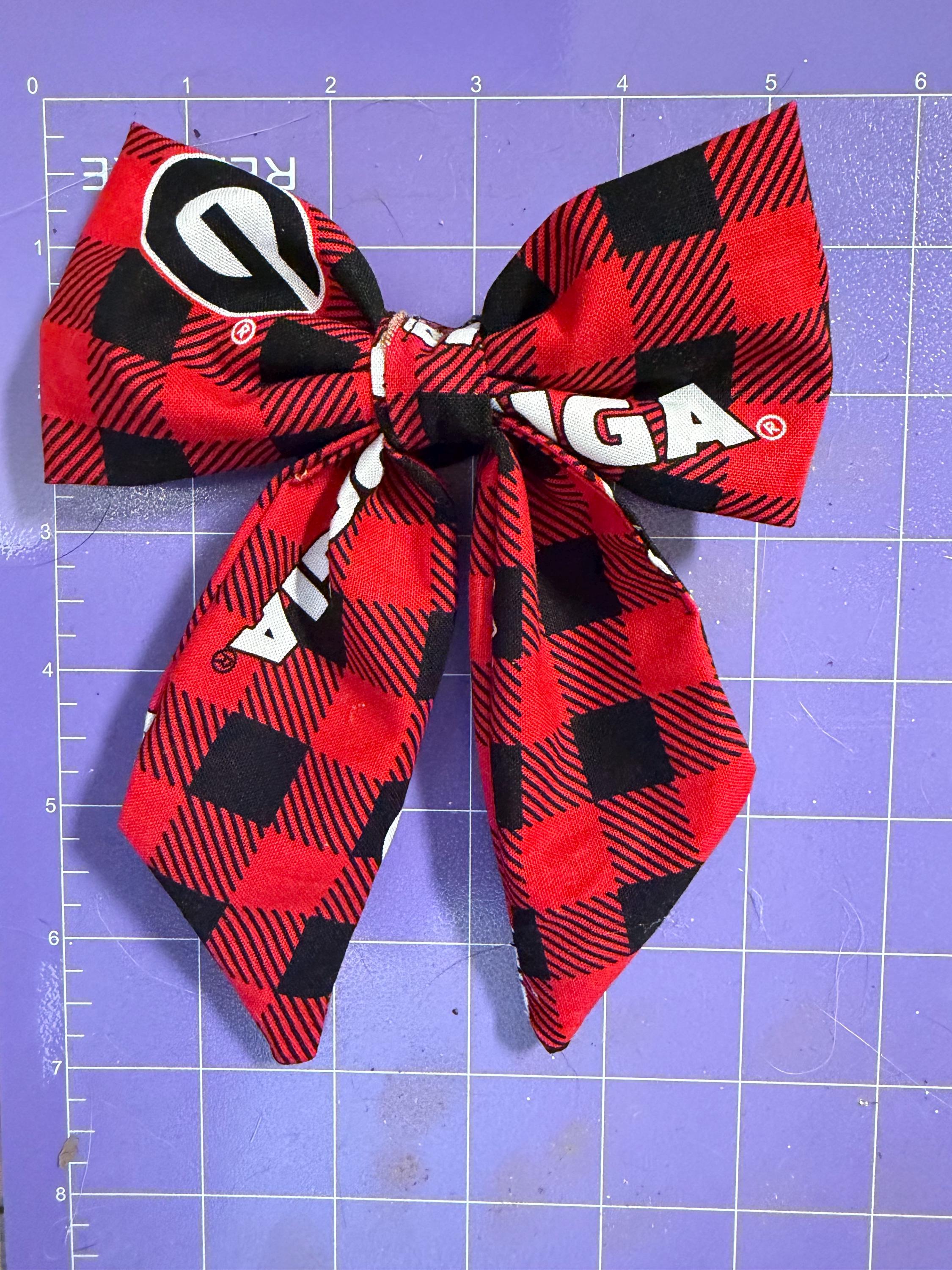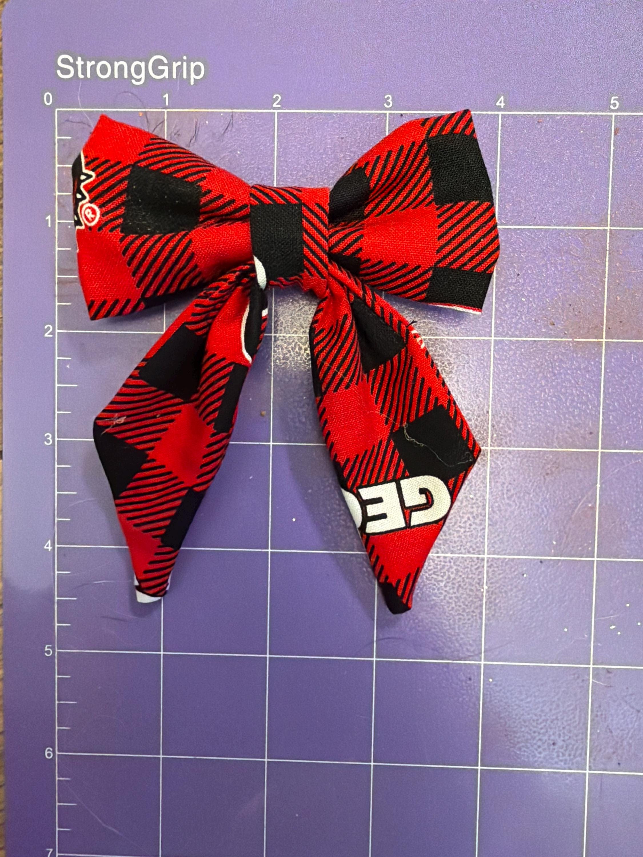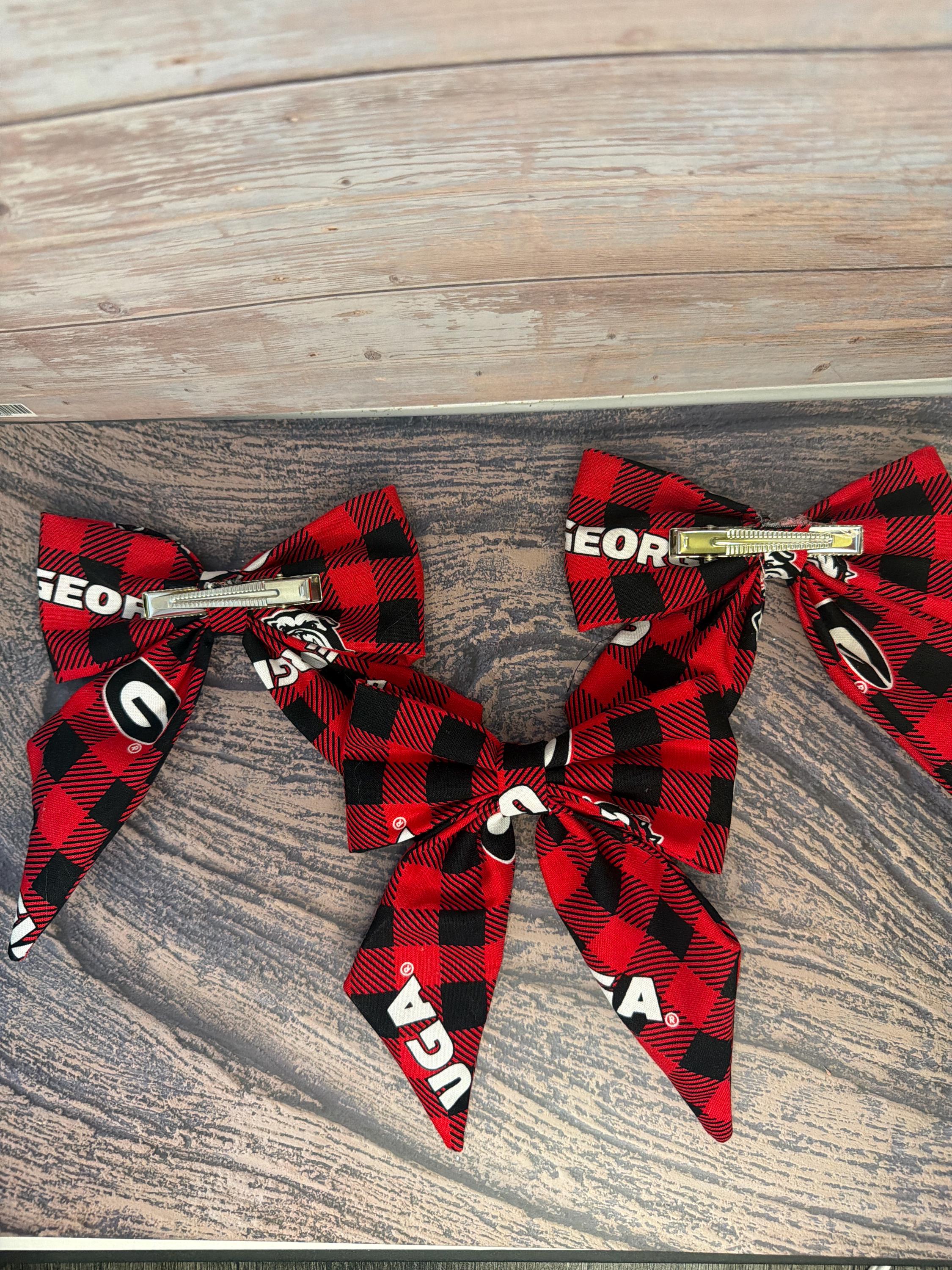 ✨ Details: • Handmade sewn fabric bow • Red & black plaid pattern (Georgia-inspired colors) • Attached to a soft, stretchy hair tie OR clip • Lightweight, durable, and comfortable • Perfect for girls of all ages