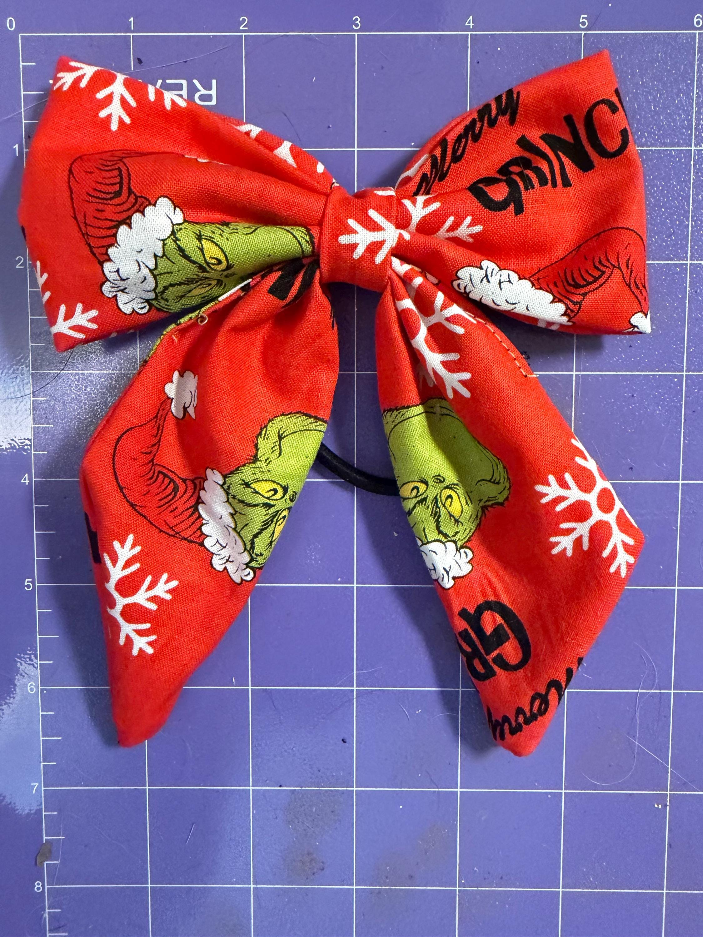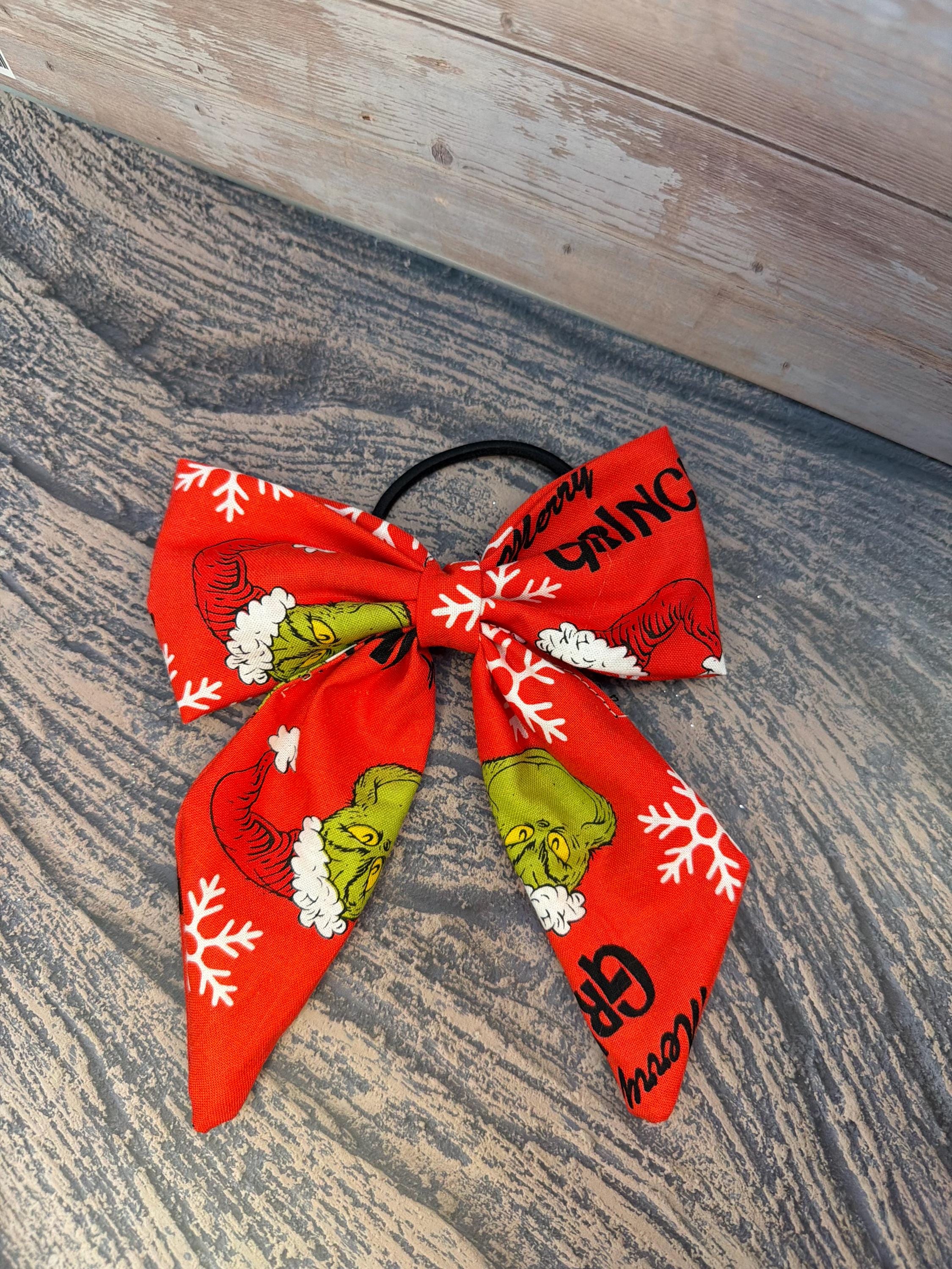 ✨ Details: • Grinch-inspired holiday print fabric • Classic boutique bow with long tails • Attached to a durable elastic hair tie • Lightweight, soft, and comfortable • Handmade with love
