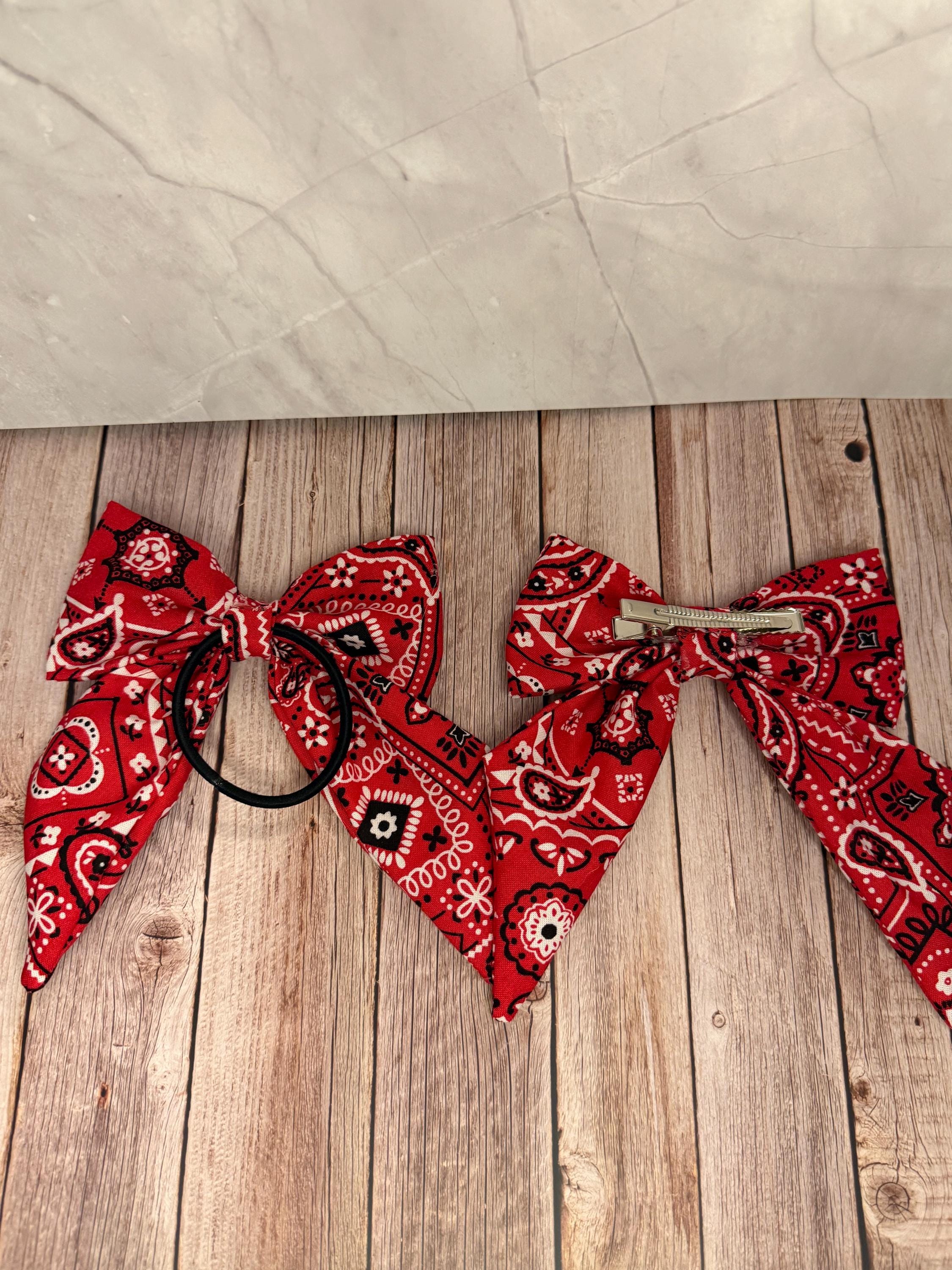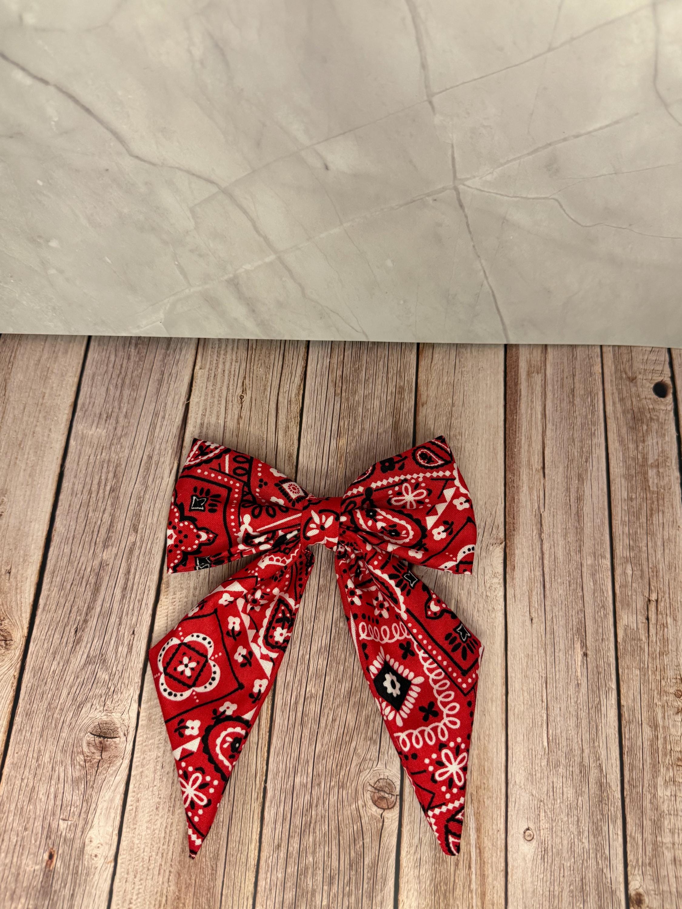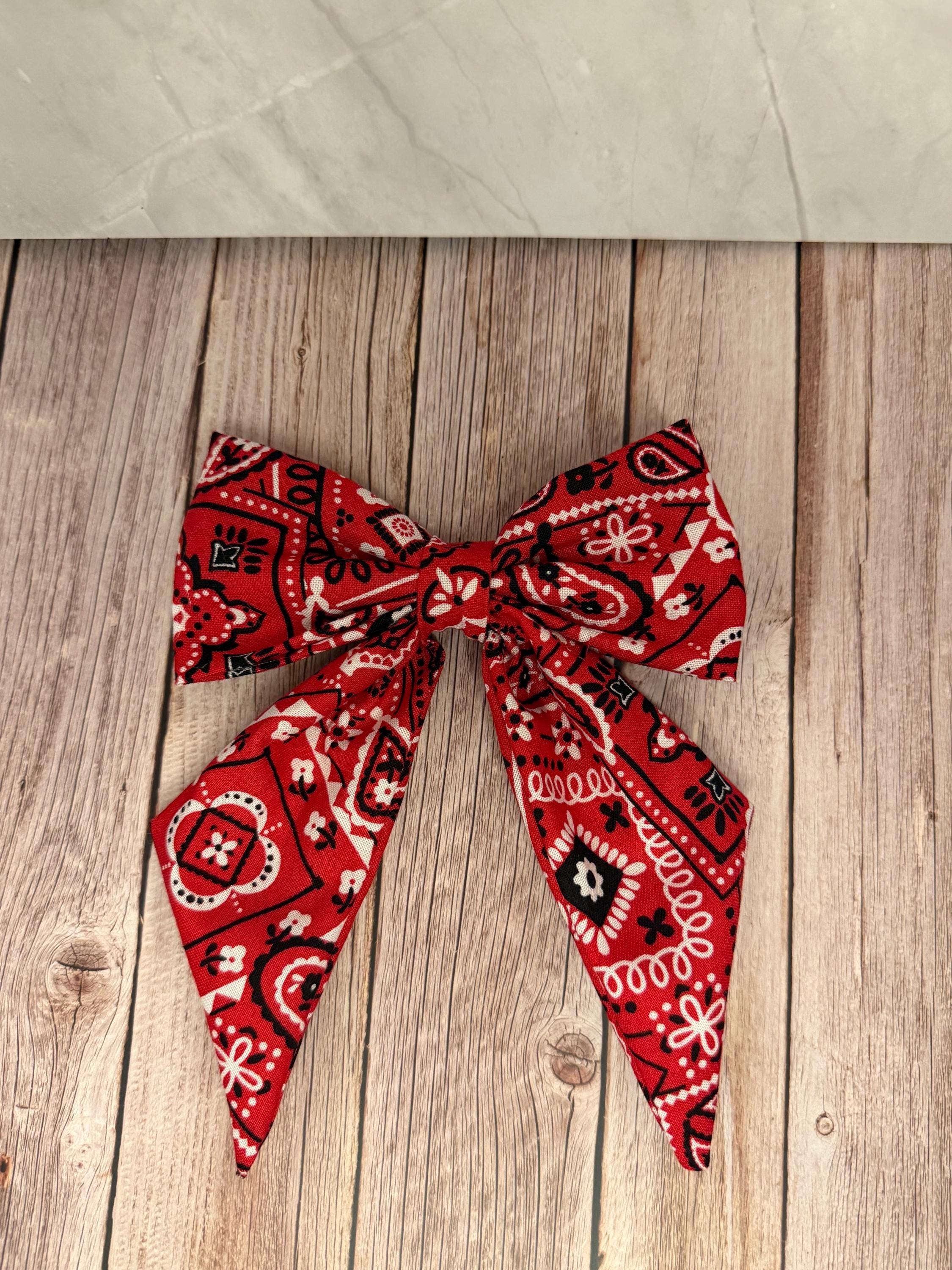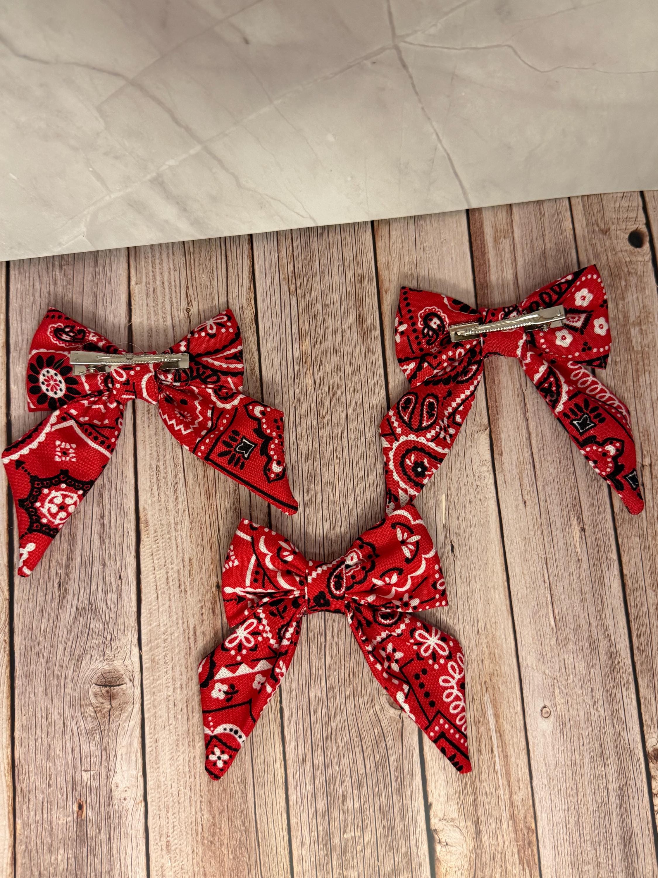 These bows are handmade with high-quality cotton fabric in a classic red bandana print, giving them that timeless, rustic, country feel Backroads and Blanks is known for.