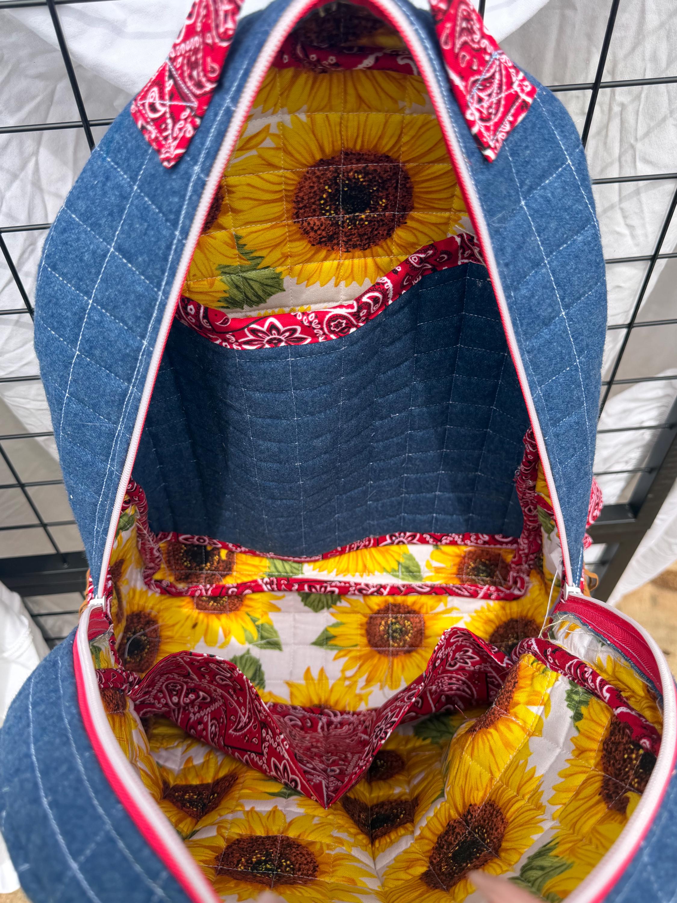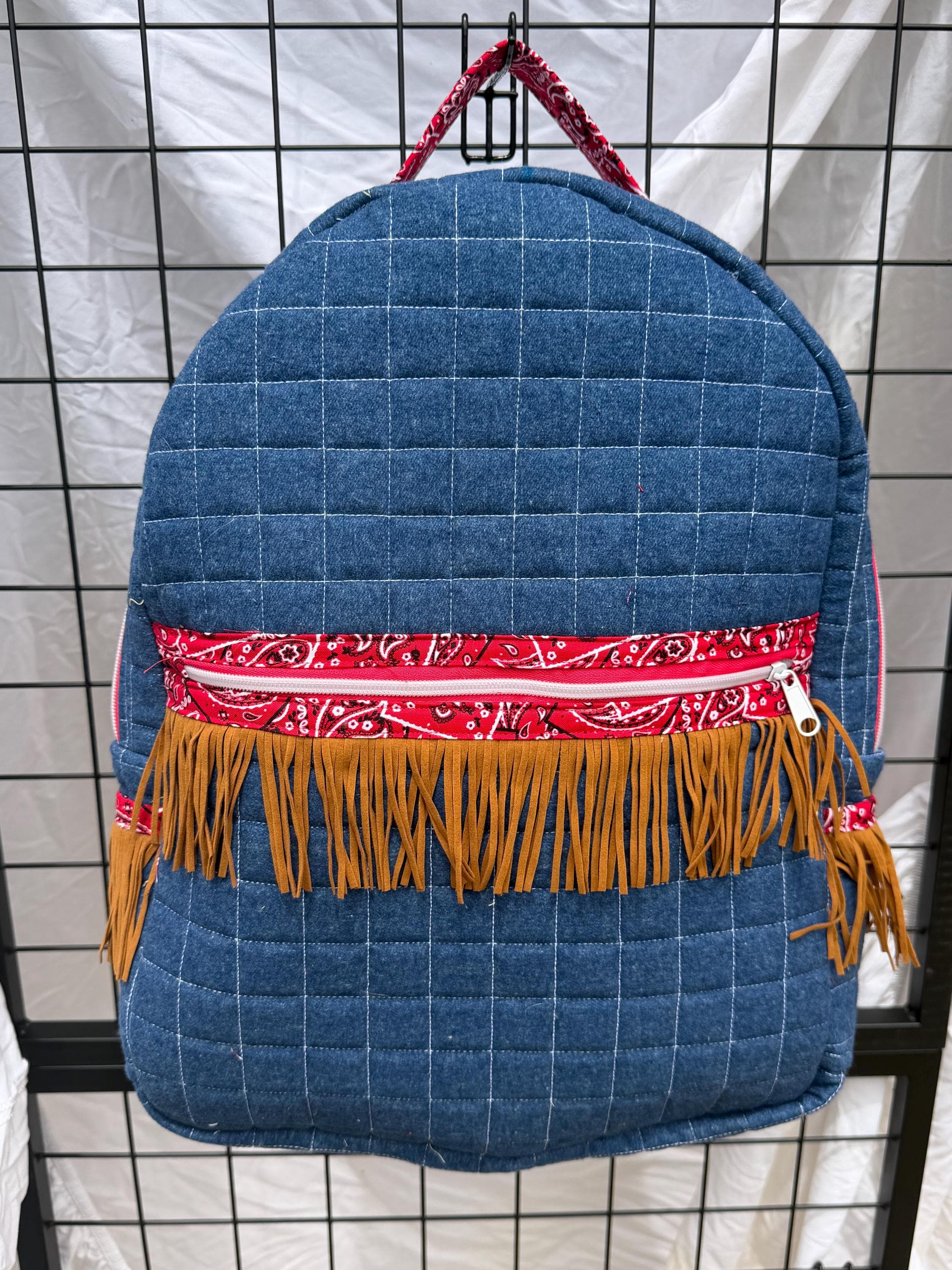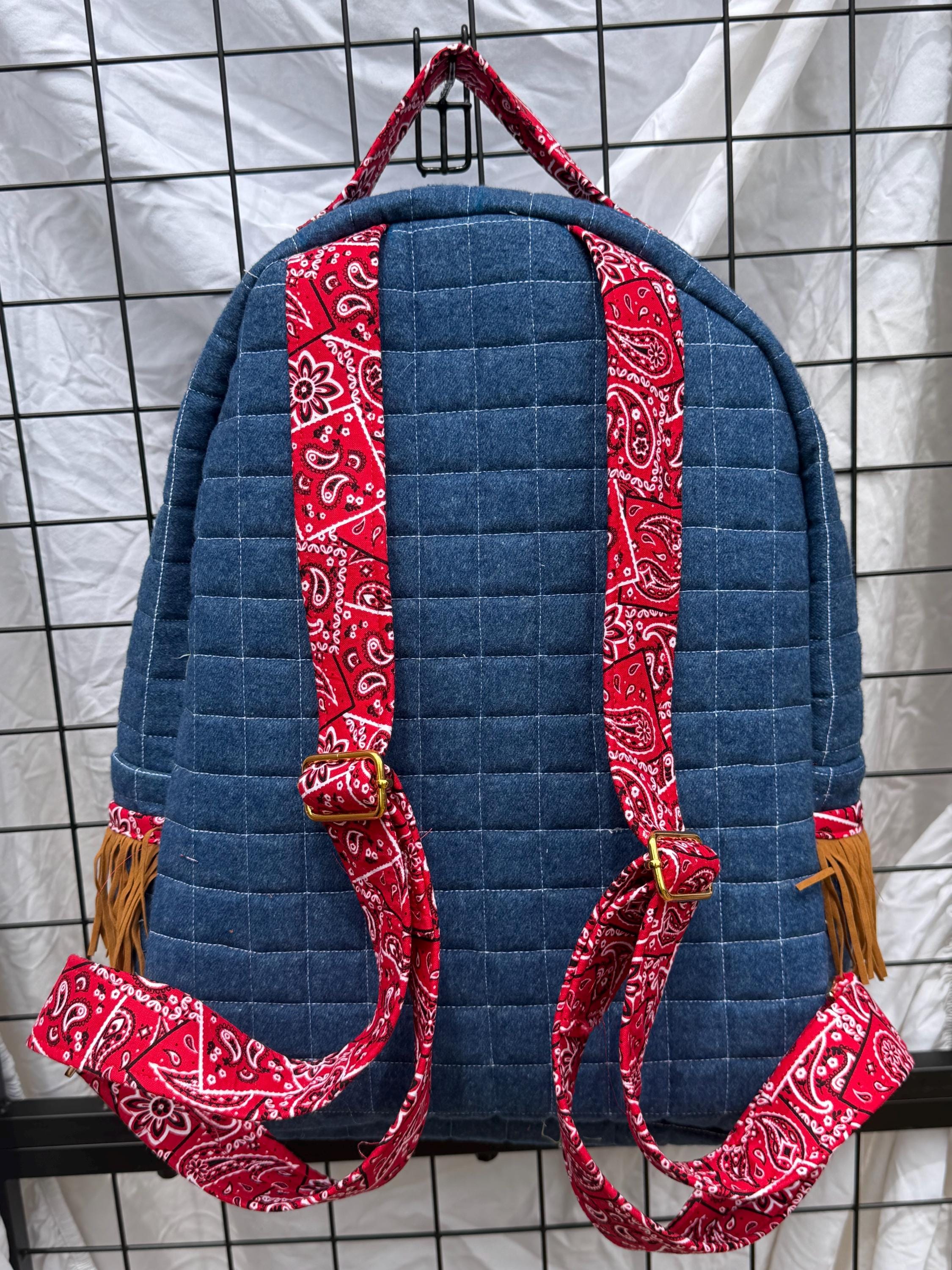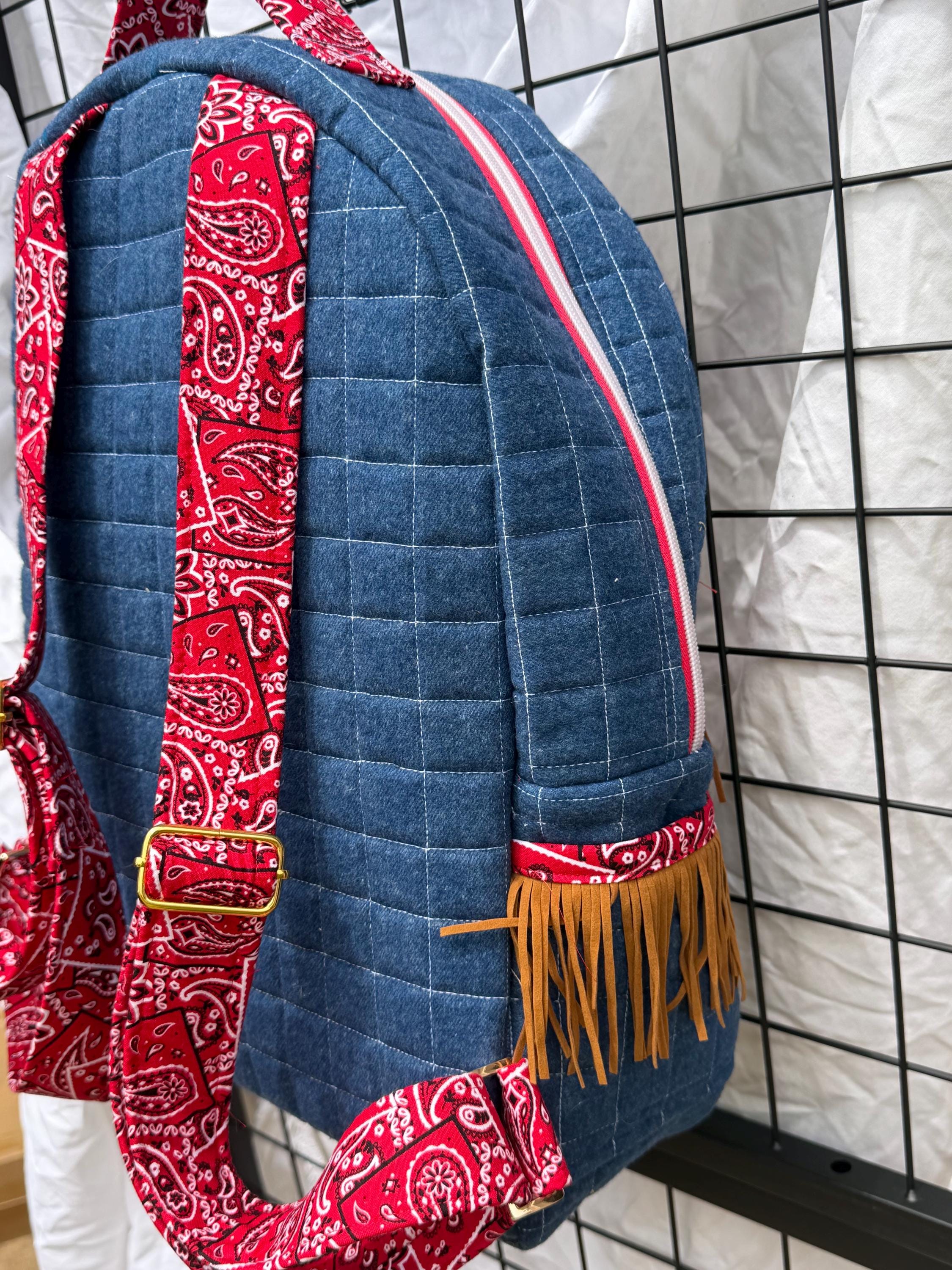 This handmade quilted backpack is crafted from durable 10oz denim and designed to handle real life while still turning heads. With bold red bandana accents, fringe detailing, and a bright sunflower interior, this bag blends rugged structure with a soft, country-inspired touch.